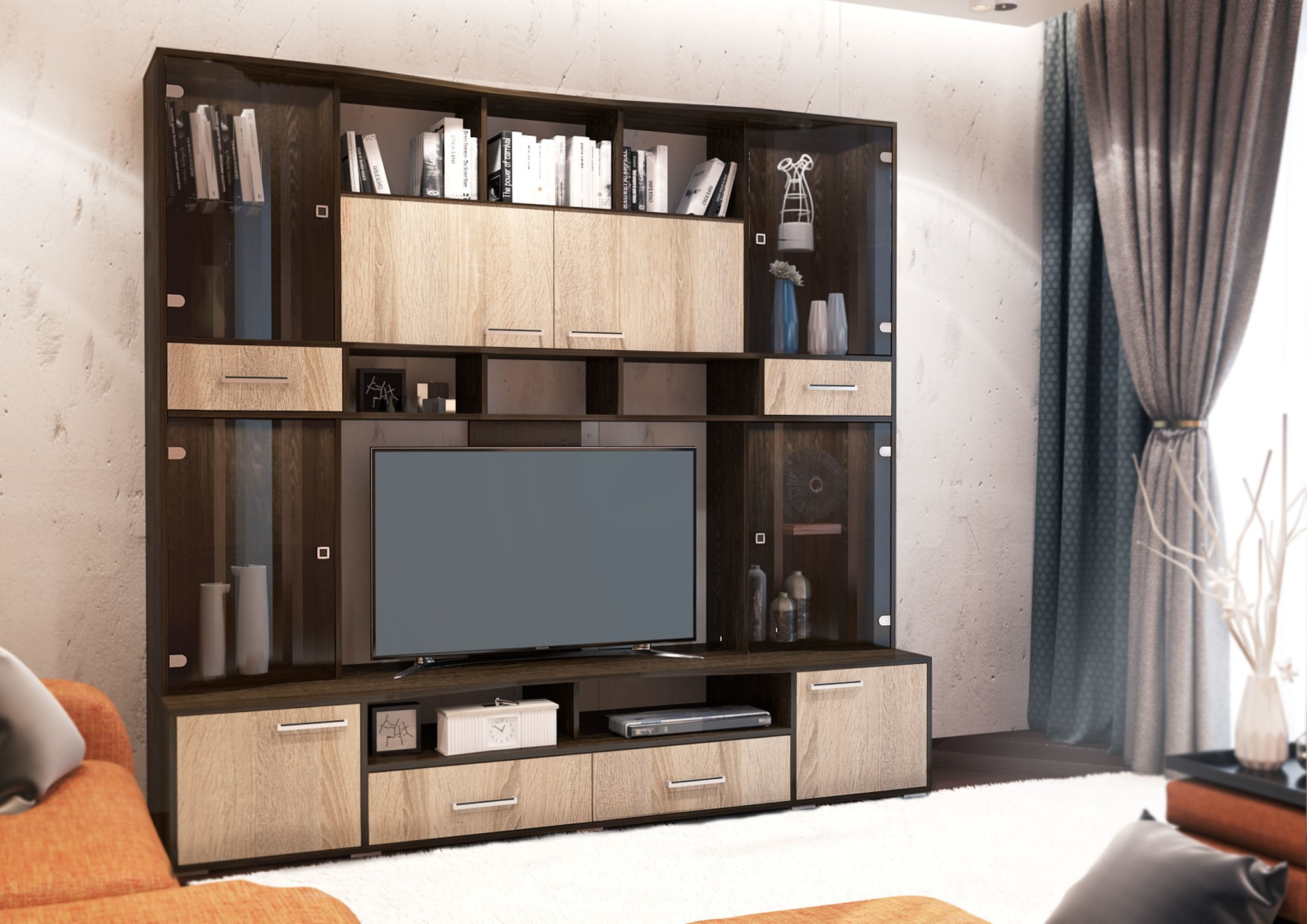 остиная Орхидея выполнена на контрастном сочетании темного Кантерберри и благородного Сонома. Состоит из системы открытых и закрытых полок и ящиков, с гнутыми тонированными стеклостворками. Также, в дополнение к гостиной можно приобрести вместительный шкаф со штангой и пенал шириной 450 мм, что добавляет еще большей функциональности, благодаря большому количеству систем хранения.Размеры стенки: 2150 х 2054 х 542 мм; размер ниши под ТВ: 1204 х 694 мм.